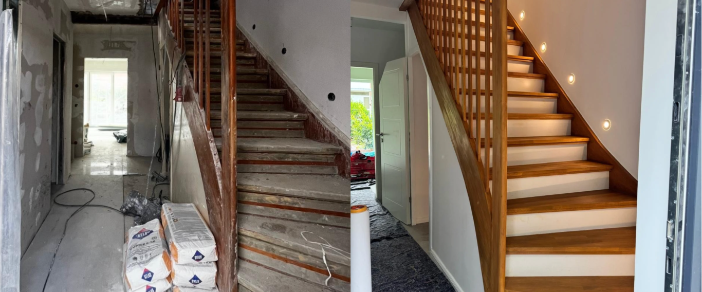 Die alte Treppe, die dem Kunden besonders am Herzen lag, wurde mit viel Sorgfalt aufgearbeitet und bewusst erhalten – modernisiert, ohne ihren Charakter zu verlieren.